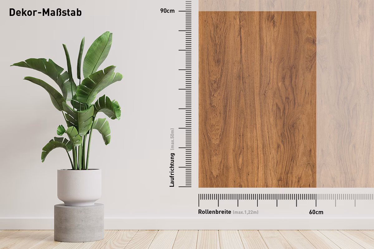 Das Dekor dieser Möbelfolie verläuft in Längsrichtung, sprich von oben nach unten (senkrecht). Achten Sie daher bei der Maßeingabe bitte darauf die Breite und Höhe nicht zu vertauschen, da sonst das Dekor um 90° gedreht liegt! Vergleichen Sie dazu bitte die nachfolgende Skizze: