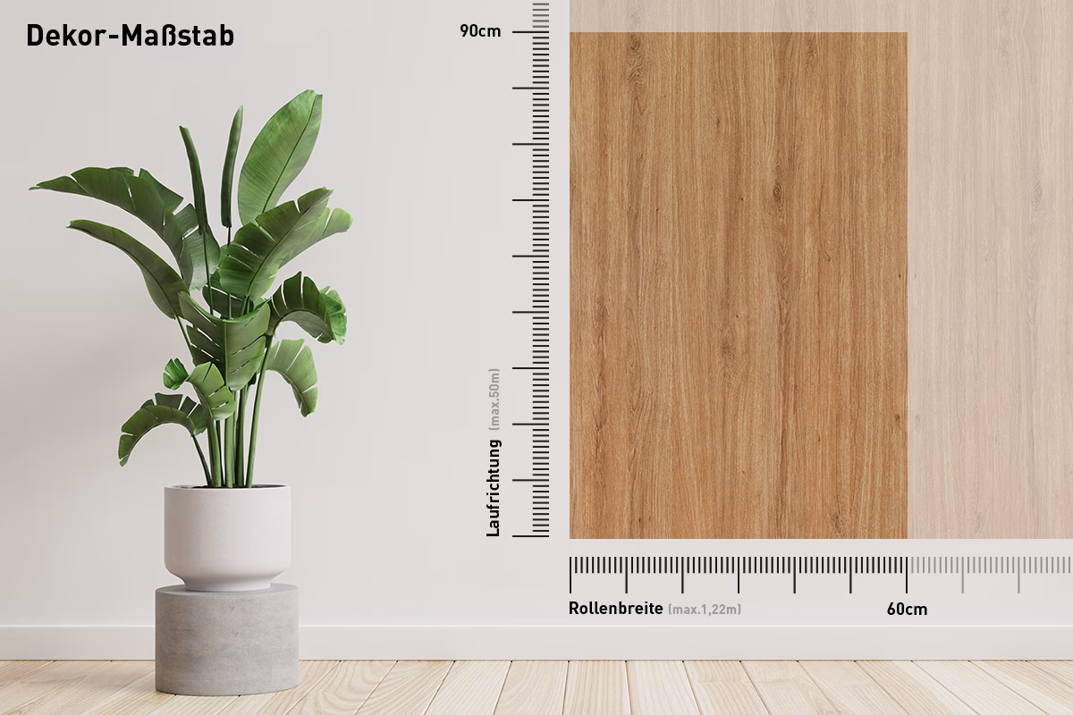 Das Dekor dieser Möbelfolie verläuft in Längsrichtung, sprich von oben nach unten (senkrecht). Achten Sie daher bei der Maßeingabe bitte darauf die Breite und Höhe nicht zu vertauschen, da sonst das Dekor um 90° gedreht liegt! Vergleichen Sie dazu bitte die nachfolgende Skizze: